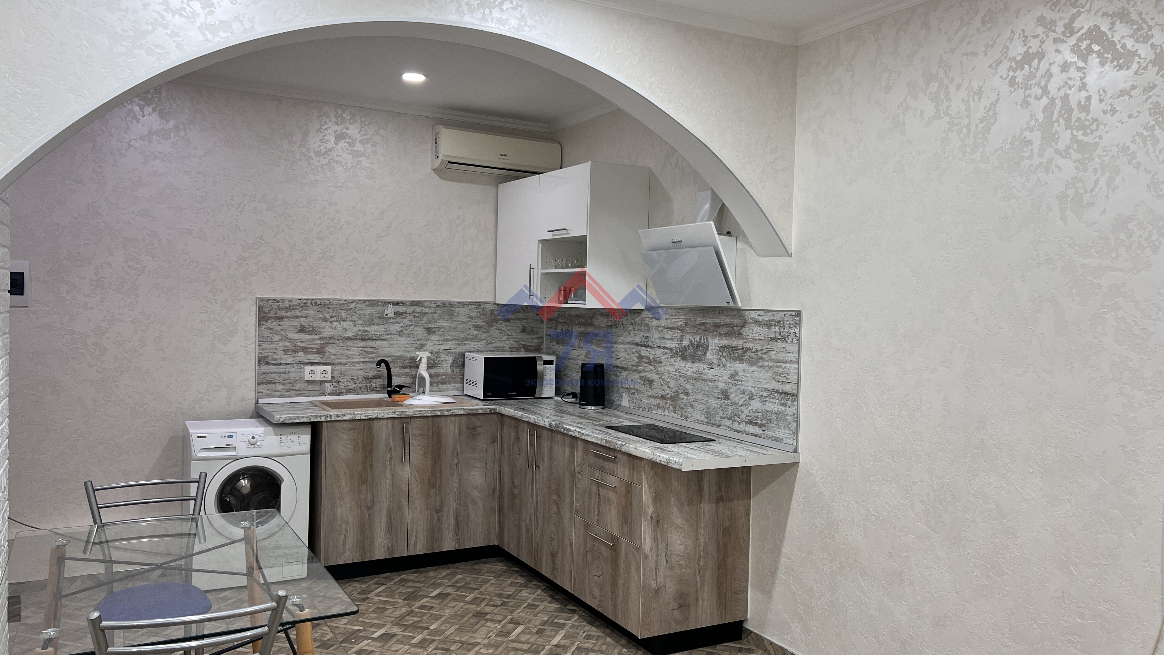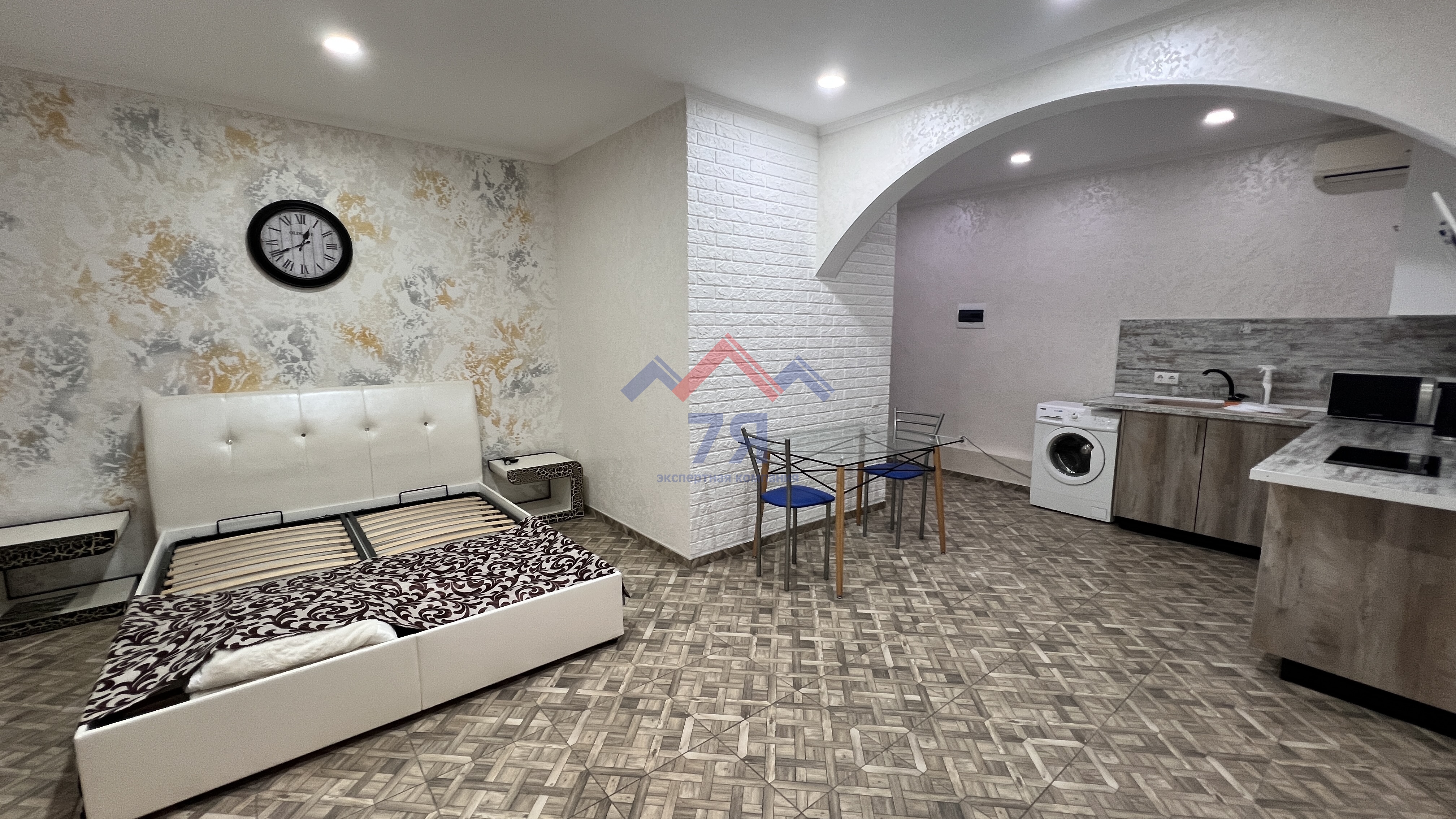 В квартире сделан отличный ремонт, установлена новая мебель и техника. Планировка свободная, есть возможность отделить кухню от жилой зоны легкой перегородкой.